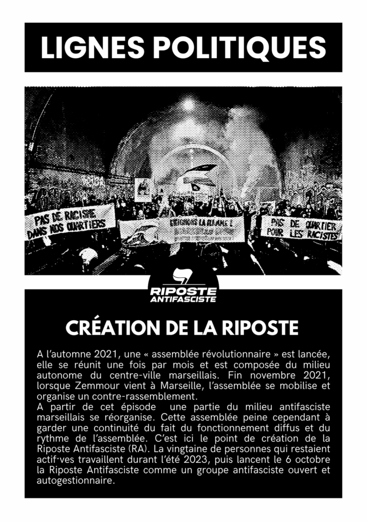 Ce manuel d’auto-défense est issu d’un ensemble de publications sur le compte Instagram de la Riposte Antifasciste Marseille (@riposte.antifasciste) entre le 29 mai 2024 et le 9 juin 2024.